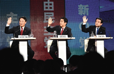 11月29日,日本東京,安倍晉三(中)代表執政黨自民黨參加黨首辯論。日本將于下月14日舉行眾議院大選投票,獲得過半數議席的政黨將贏得政權。