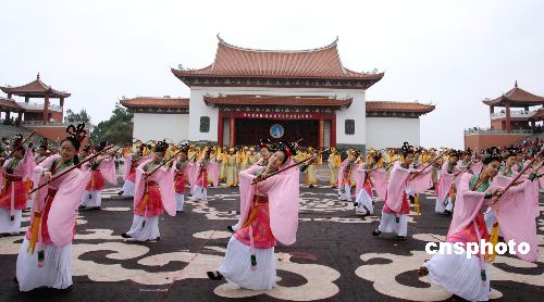 11月1日,第九屆中國·湄州媽祖文化旅游節在媽祖故鄉福建省莆田市湄州島開幕,來自海內外一萬多人參加本屆湄州媽祖文化旅游節。圖為廣場表演精彩的文藝演出。 中新社發 張勤 攝