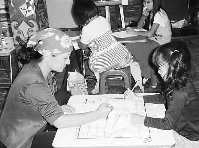 圖為二姐包梅芳教小朋友畫畫