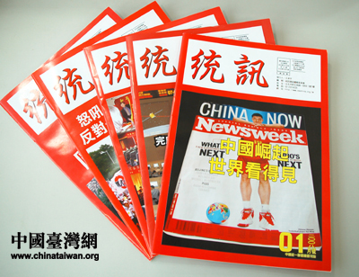 王津平向中國臺灣網(wǎng)記者贈送的中國統(tǒng)一聯(lián)盟機(jī)關(guān)刊物《統(tǒng)訊》