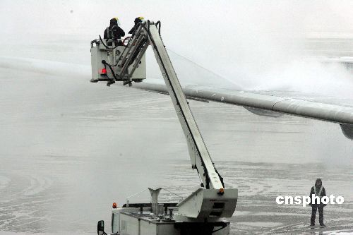2月2日上午,2008年兩岸春節(jié)包機(jī)上海航點(diǎn)首個(gè)航班——東航MU五00七次航班,冒著數(shù)十年未遇的罕見(jiàn)風(fēng)雪在上海浦東機(jī)場(chǎng)起飛。圖為浦東機(jī)場(chǎng)為春節(jié)包機(jī)優(yōu)先提供特別的除冰服務(wù)。 中新社發(fā) 潘索菲 攝