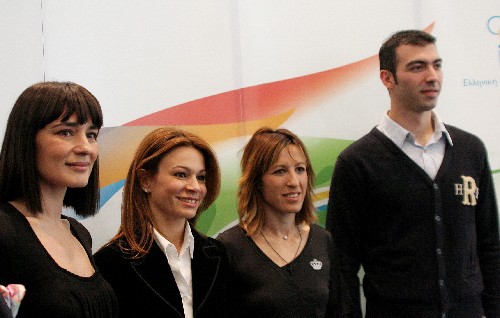 3月13日,北京奧運會圣火采集儀式最高女祭司瑪利亞·娜芙普利都(左一)、儀式編導阿特密斯·伊格娜迪歐(左二)、第一火炬手亞歷山大·尼克拉澤斯(右一)、最后一名火炬手皮吉·德維茨出席希臘奧委會舉行的新聞發布會。按計劃,北京奧運會圣火將于3月24日在奧林匹亞采集。 新華社記者梁業倩攝