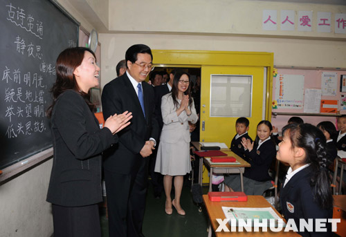 走進三樓一間教室,胡錦濤旁聽了三年級的一堂中文課。黑板上書寫著用“以前”、“以后”造句的示范和《靜夜思》的詩句。女教師張延華讓全體同學(xué)一起朗誦《靜夜思》。隨后,孩子們又為胡爺爺背誦了孟浩然的《春曉》。聽著這些在海外成長的孩子們用稚嫩童音朗誦“床前明月光”、“春眠不覺曉”這些中國歷史上千年傳誦的佳句,胡錦濤頷首微笑。
