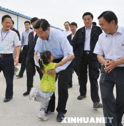 5月30日,中共中央政治局常委、全國(guó)政協(xié)主席賈慶林先后來到汶川特大地震震中區(qū)的映秀鎮(zhèn)和都江堰市等重災(zāi)區(qū),實(shí)地察看災(zāi)情,慰問看望災(zāi)區(qū)干部群眾和救援人員,指導(dǎo)抗震救災(zāi)工作。這是賈慶林來到都江堰市幸福家園賑災(zāi)居民安置點(diǎn)看望學(xué)生。帳篷幼兒園的孩子們高喊著“賈爺爺好賈爺爺好”跑過來,賈慶林親切地抱起一個(gè)撲進(jìn)他懷中的孩子。 新華社記者 樊如鈞 攝