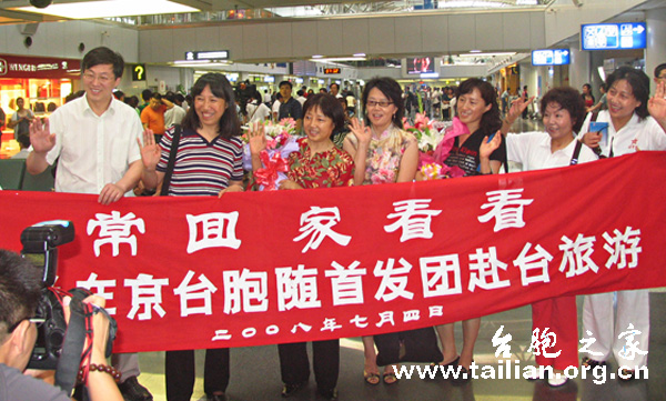 北京市臺(tái)聯(lián)副會(huì)長(zhǎng)葉芳、鄭大等人專門到機(jī)場(chǎng)為她們送行。當(dāng)大家拉開(kāi)寫有“常回家看看—?dú)g送在京臺(tái)胞隨首發(fā)團(tuán)赴臺(tái)旅游”的橫幅合影留念時(shí),立刻引來(lái)了眾多在場(chǎng)的記者和游客們的鏡頭和關(guān)注。