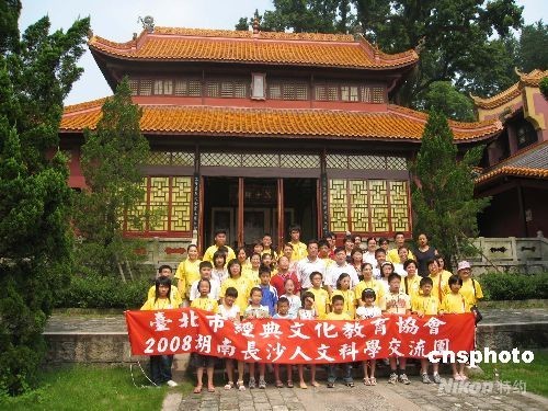 7月17日,來自臺灣“親子讀經班”的人文科學交流團與大陸家庭一同在岳麓書院文廟前合影。據悉,家長和孩子一起誦讀古文經典在臺灣已經蔚然成風,推廣該教育模式的臺北市經典文化教育協會決定在大陸復制,并選擇長沙作為首個示范地推廣。 中新社發 劉雙雙 攝