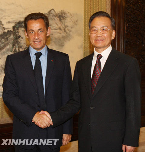 8月8日,中國國務院總理溫家寶在北京會見前來出席北京奧運會開幕式的法國總統薩科齊。新華社記者劉衛兵攝