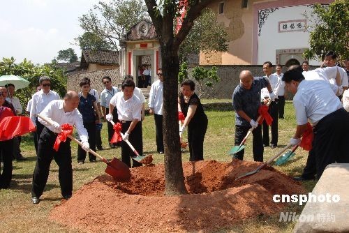 八月十四日下午,中國國民黨主席吳伯雄一行在福建永定縣高北土樓群的“土樓王”承啟樓前種下一棵香樟樹,紀(jì)念此次祖地之行。 中新社發(fā) 鄭祚聲 攝