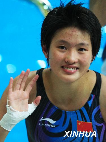 8月21日,中國選手陳若琳在比賽中向觀眾揮手致意。當日,北京奧運會跳水比賽在國家游泳中心——“水立方”繼續進行,陳若琳在女子10米跳臺決賽中以447.70分的總成績奪得金牌。新華社記者劉宇攝