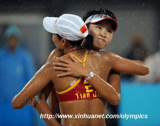 8月21日,中國選手王潔(后)/田佳擁抱慶勝利。當日,在北京奧運會沙灘排球女子冠亞軍決賽中,中國選手王潔/田佳以0比2負于美國選手克麗·沃爾什/米絲蒂·梅-特雷納,獲得亞軍。 新華社記者沙達提攝