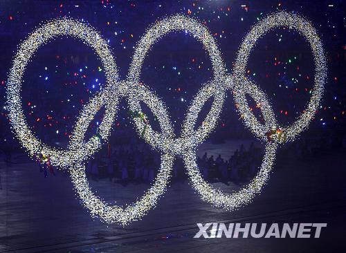 8月8日晚8時,第29屆夏季奧林匹克運動會在國家體育場——“鳥巢”隆重開幕。這是在開幕式上閃閃發(fā)光的夢幻“五環(huán)”。新華社記者 邢廣利 攝