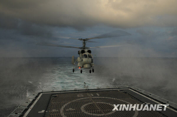 12月28日夜,中國赴亞丁灣、索馬里海域護(hù)航編隊(duì)組織夜間直升機(jī)行進(jìn)間著艦訓(xùn)練。新華社發(fā)
