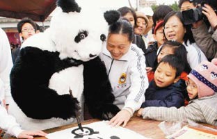 第五屆漢字文化節(jié)活動昨天在臺北舉行,吸引萬人參加,連“大熊貓”也寫起書法,深受小朋友喜愛。來源:臺灣《聯(lián)合報(bào)》