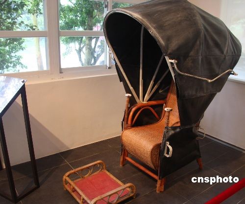 由臺灣軍方管制半個世紀的后慈湖今年五月一日將向普通游客揭開神秘的面紗。上世紀六十年代臺灣當局策劃反攻大陸的“國光計劃”時,曾在此建有五座戰備辦公室。圖為三號辦公室內陳列的蔣介石的轎子。 中新社發 耿軍 攝