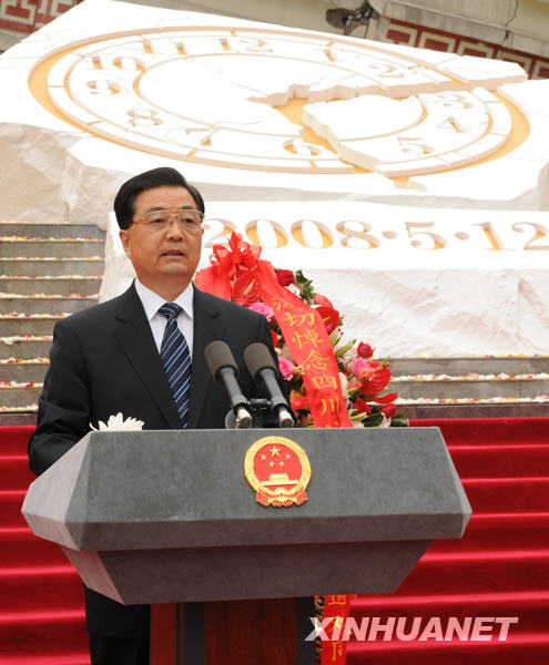 5月12日,紀念汶川特大地震一周年活動在四川省汶川縣映秀鎮隆重舉行。中共中央總書記、國家主席、中央軍委主席胡錦濤發表重要講話。新華社記者樊如鈞攝
