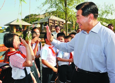 5月15日,中共中央政治局常委、全國政協主席賈慶林在泉州考察時與孩子們在一起。常剛 攝