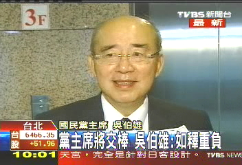 馬英九前晚與吳伯雄會面,兩人會談決定今天下午于國民黨中常會后共同召開記者會。對于兩人前晚的會談,吳伯雄說,“他告訴我他的決定,我本來就是絕對配合”;去年5月談到黨主席由馬英九來兼任的時候,“我就是無所求、無所爭,只要對大局有利,我都可以配合,我的心意沒有變過”。