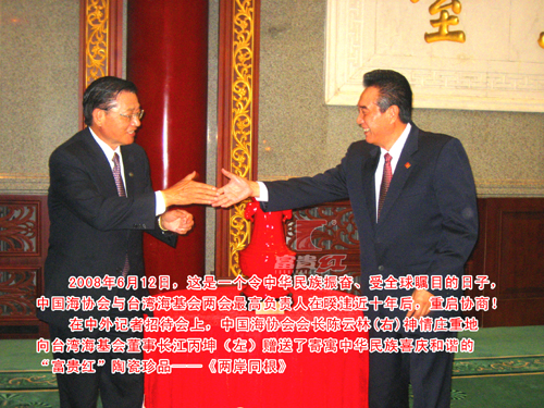 2008年6月12日,臺灣海峽交流基金會董事長江丙坤先生一行回中國大陸協商兩岸關系改善與發展,中國海峽會會長陳云林先生贈送的禮品為福建省富貴紅文化發展有限公司藝術總監徐少東先生創作的富貴紅陶瓷藝術作品《兩岸同根》。相對于會談議題,似乎只是輕描淡寫的一次禮品互贈,但對于陶瓷業界來說卻引起了不小的轟動,引發了人們對陶瓷藝術品《兩岸同根》的關注。人們不禁會問:《兩岸同根》何以在這樣的一個高規格的、意義非同一般的兩岸對話中受到如此高的禮遇?其實,我們將余光中的《鄉愁》與徐少東的《兩岸同根》置放在一起進行比較的時候,兩者雖是以不同的語言載體進行表現的藝術作品,但我們仍然不難發現其中的緣由。