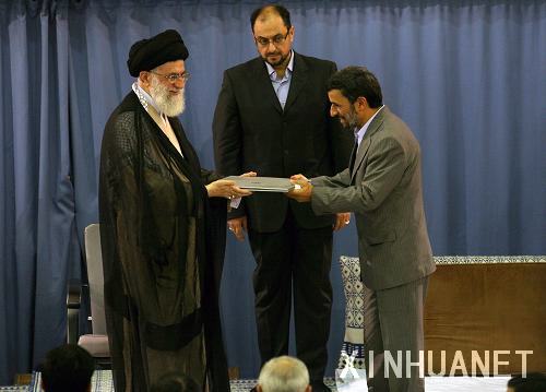 8月3日,在伊朗首都德黑蘭,伊朗最高領(lǐng)袖哈梅內(nèi)伊正式批準(zhǔn)艾哈邁迪-內(nèi)賈德為伊朗第10屆總統(tǒng)。這是哈梅內(nèi)伊(左)當(dāng)天向艾哈邁迪-內(nèi)賈德(右)頒發(fā)總統(tǒng)委任函。新華社發(fā)