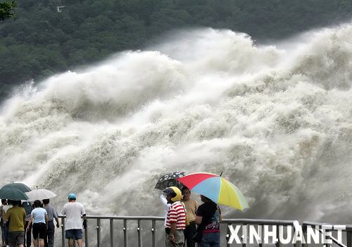 8月8日,臺灣桃園石門水庫實施調節性排洪。今年第8號臺風“莫拉克”給臺灣部分地區帶來大量降雨,原本缺水的臺灣桃園石門水庫目前已接近滿水位。考慮到水庫結構安全,石門水庫從8日2時起實施調節性排洪。新華社發(吳景騰 攝)