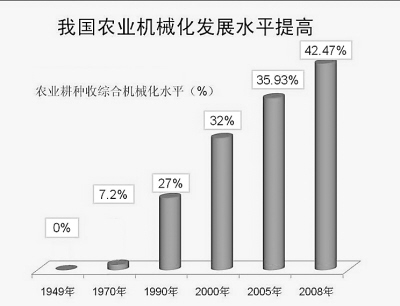 新中國成立之初,我國人均占有209公斤原糧,有錢人多吃一口,很多人就要餓肚子。1949年以來,我國糧食生產先后登上了3000億斤、6000億斤、8000億斤、10000億斤幾大臺階。同時,經濟作物生產協調發展。2008年全國棉花總產量達到749萬噸,比1949年的44萬噸增長了16倍;油料總產2952.8萬噸,糖料總產13419.6萬噸,分別比1949年增長了10.5倍和46.3倍。2004—2008年,糧食連續5年增產,2009年實現夏糧連續6年增產,為經濟社會平穩較快發展和應對各種困難局面奠定了基礎。