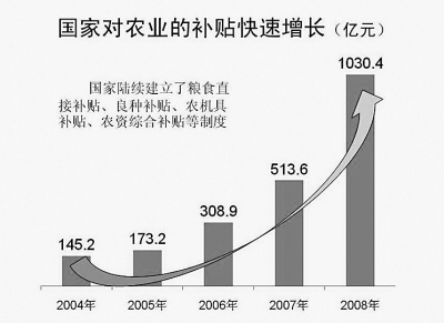 2004年開始,先后對種糧農民實施了直接補貼、良種補貼、農機具補貼、農業生產資料綜合直補政策。2009年,“四補貼”金額已達到1230億元。一減一加,農民得到巨大實惠。