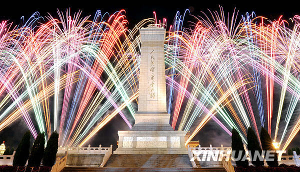 10月1日,首都各界慶祝中華人民共和國(guó)成立60周年聯(lián)歡晚會(huì)在北京天安門廣場(chǎng)舉行。這是天安門廣場(chǎng)燃放煙花。新華社記者王毓國(guó)攝
