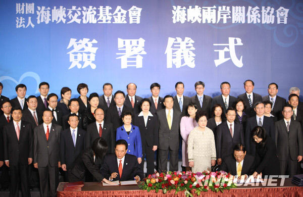 這是海協會會長陳云林(前左)與海基會董事長江丙坤在簽署協議。