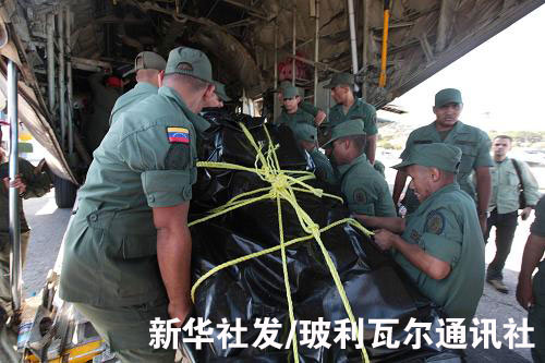 1月15日,在委內(nèi)瑞拉邁克蒂亞的國際機(jī)場,委內(nèi)瑞拉軍人將救災(zāi)物資搬運(yùn)上飛機(jī)。當(dāng)日,委內(nèi)瑞拉支援海地地震災(zāi)區(qū)的第二批救援人員攜帶救災(zāi)物資奔赴海地。第二批救援人員共29人,其中包括25名軍方人員、2名地震專家和2名民防專家。新華社發(fā)/玻利瓦爾通訊社