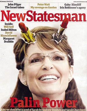 美國前阿拉斯加州州長、2008年總統大選副總統候選人薩拉·佩林被稱為共和黨的“黷武主義者”。日前佩林遭英國左翼雜志《新政客》惡搞,封面照片中佩林變身惡魔,頭上長出“口紅雙角”。