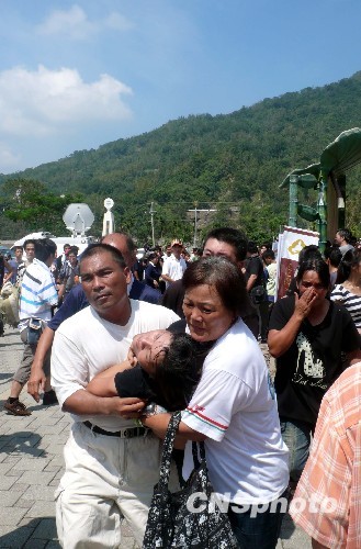 8月15日,高雄縣甲仙鄉百姓舉辦法會,悼念7天前在“莫拉克”臺風中遇難的小林村村民。8日清晨,處在高雄縣北部偏遠山區的甲仙鄉小林村在“莫拉克”臺風中被突發泥石流夷為平地。據日前臺灣災害應變中心公布的數據,小林村約160余戶人家、300多名村民遇難。圖為一名婦女在悼念活動中昏厥送醫。 中新社發 劉舒凌 攝