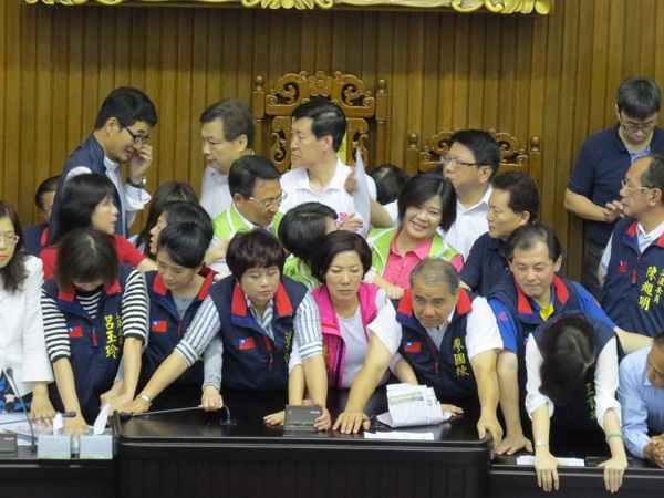 中國臺灣網6月25日消息 據臺灣“中廣新聞網”報道,今天是臺灣“立法院”本次臨時會的最后一天,而為了讓證所稅、12年義務教育及核四“公投案”能過完成“二、三讀”程序,國民黨“立院”黨團今天發出行動,一早6點40分就占據了議場主席臺。不過在野黨也不示弱,不到7點,也進入會場表達不滿,雙方還一度發生推擠沖突,并且持續對峙中。
