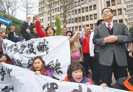 李朝卿昨日由正、副議長何勝豐、潘一全等人陪同,到臺當局“內政部”申請復職。(圖片來自臺灣《中國時報》)