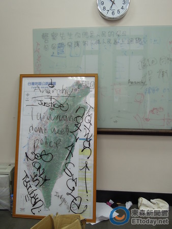 “政委”陳希舜的辦公室,能破的都破了,滿地煙灰垃圾,桌椅都被移動到辦公室外。(圖片來自臺媒)