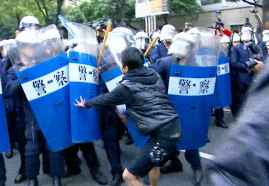 學生肉身撞盾牌,不肯驅離鎮暴警察直接逮捕。(臺媒圖)