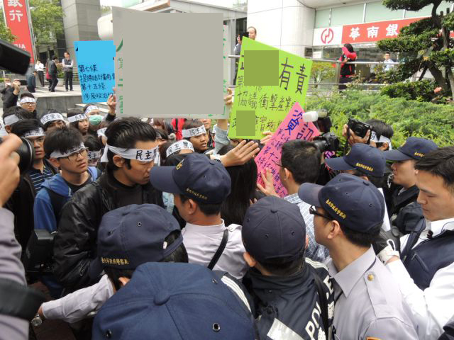 反服貿(mào)學(xué)生,2日中午前往國民黨中央黨部抗議,并與警察發(fā)生推擠沖突。(圖片來自臺媒)