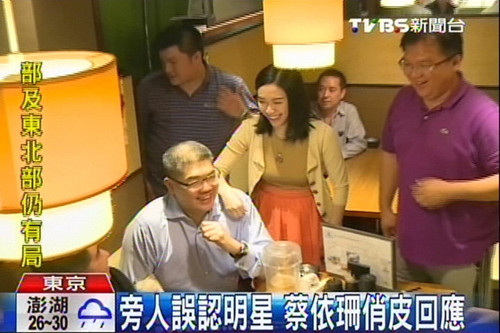 報道說,在餐聚的歡樂氣氛當中,蔡依珊比較自在,但還是有一點害怕鏡頭。在東京,蔡依珊沒有陪連勝文跑行程,她說自己走走逛逛,給孩子買了蚊蟲藥。