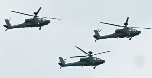 日前慶祝黃埔90周年紀念活動上,臺灣陸軍三架阿帕奇攻擊直升機編隊進行空中分列,接受馬英九校閱,現在傳出機上有尚未合格的飛官,引起爭議。 (圖片來源:臺灣《聯合報》)