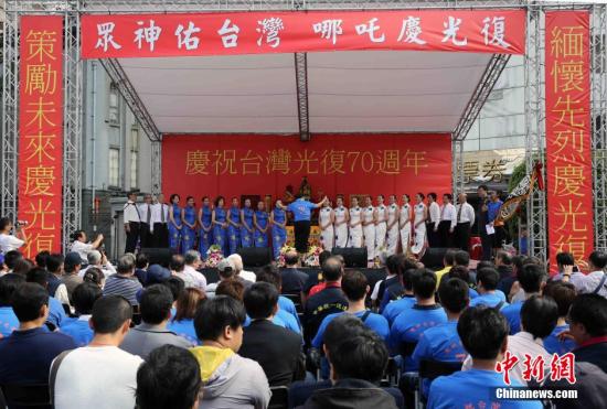 10月25日,多個民間團體在臺北中山堂、凱達(dá)格蘭大道等地舉辦慶祝臺灣光復(fù)70周年活動。其中,中華統(tǒng)一促進(jìn)黨在中山堂廣場祭祀兩岸抗日烈士英靈,祈愿兩岸和平團圓,并結(jié)合各地民間信仰團體在傳統(tǒng)老城區(qū)舉辦巡游活動。(中新社記者 任海霞 攝 )