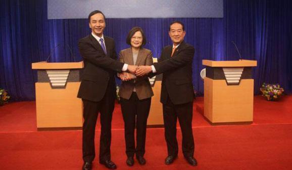 首場2016候選人電視政見發表會25日晚間時舉行,親民黨宋楚瑜(右起)、民進黨蔡英文、國民黨朱立倫依序發言。(圖片取自臺灣中時電子報)