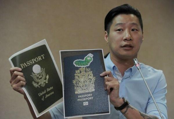 “立委”展示美國和加拿大護照上的貼紙樣本