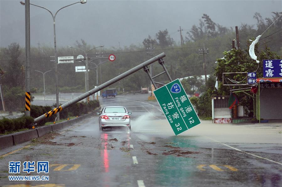 9月14日,在屏東到墾丁的公路上,路牌被大風吹倒。當日,超強臺風“莫蘭蒂”掠過臺灣南部地區(qū),最大陣風達16級,造成多地停電,給當?shù)鼐用竦纳顜韲乐赜绊憽?新華社 發(fā))