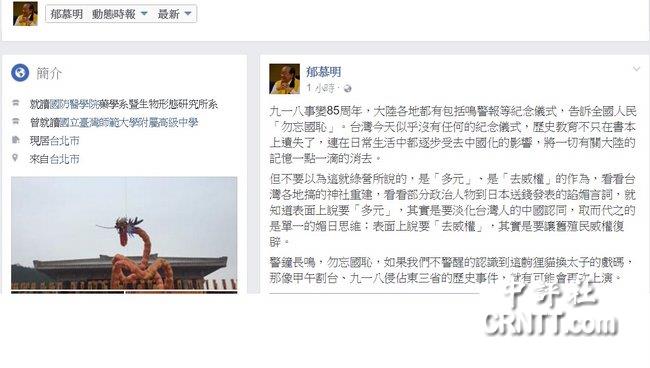 9·18事變85周年,臺灣新黨主席郁慕明在臉書上發文指出,大陸各地都有包括鳴警報等紀念儀式,告訴全國人民“勿忘國恥”。臺灣卻沒有任何的紀念儀式,歷史教育不只在書本上遺失了,連在日常生活中都逐步受“去中國化”的影響,將一切有關大陸的記憶一點一滴的消去。