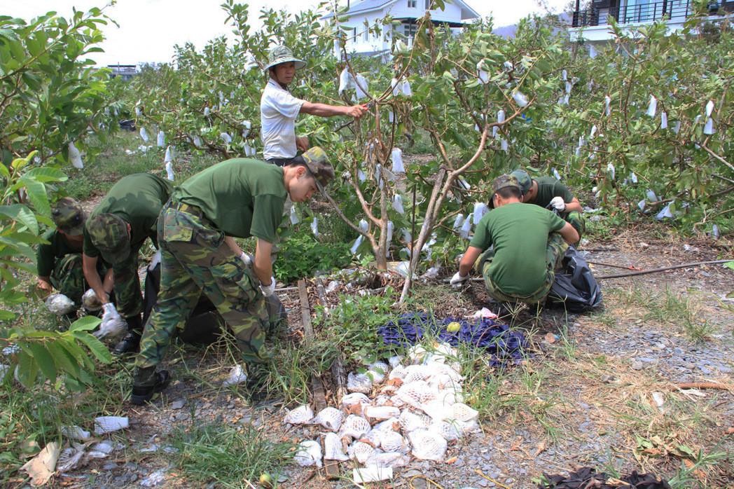 臺軍近年常因民代要求,常為私人農田服務。圖為臺軍去年在私人番石榴園協助清理落果。(臺灣《聯合報》資料圖)