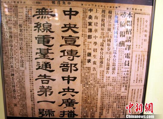 圖為臺灣“中央廣播電臺”文史館展出的該臺創臺和開播前一日,當時的“中央日報”刊登的預告消息。