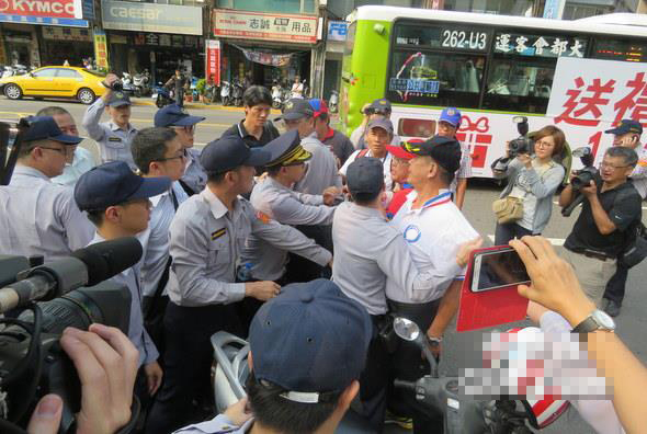 雙方在現(xiàn)場一陣拉扯,互相嗆聲,“愛國同心會”人士趁機奪下“臺聯(lián)黨”的抗議牌子撕爛,高喊“只有中國,沒有兩邊”、“回去找你們李登輝”。隨后警方強行介入隔開雙方,還要求“一人一邊、各自表述”,不要有違法的言行。