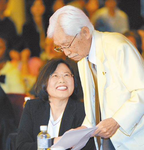 圖為2010年蔡英文出席研討活動,與辜寬敏相互致意。(臺灣“中時電子報”資料圖)