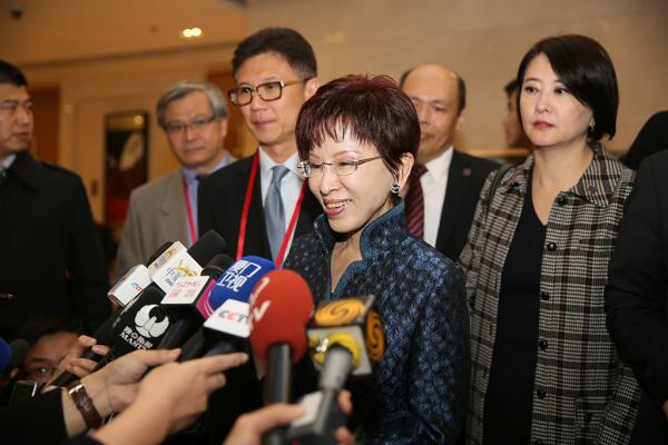 11月2日下午,北京,洪秀柱參加完“兩岸和平發展論壇”分組討論后接受媒體采訪。 澎湃新聞見習記者 謝匡時 圖11月2日下午,中國國民黨主席洪秀柱來到在北京舉行的兩岸和平發展論壇會場。