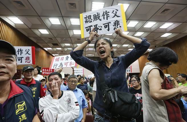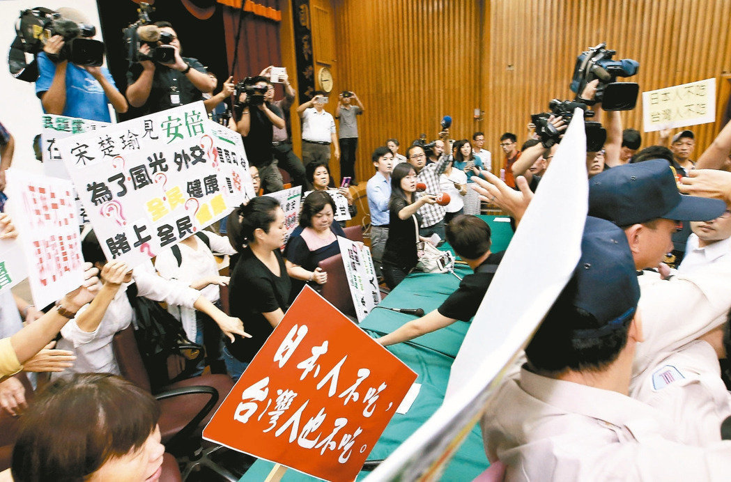 日本食品輸臺公聽會臺北場日前在臺當(dāng)局“農(nóng)糧署”舉行,會議沒開始就大亂,藍(lán)營民代與民眾現(xiàn)場抗議,認(rèn)為會議名稱應(yīng)改為日本核災(zāi)食品輸臺公聽會,現(xiàn)場一片混亂。(圖片來源:臺灣《聯(lián)合報(bào)》)
