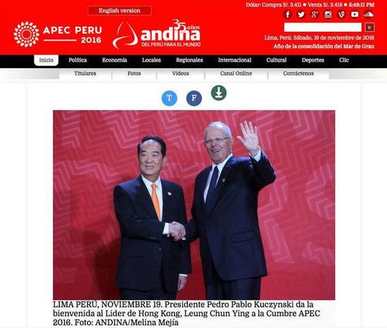 據臺灣“聯合新聞網”11月20日報道,正在秘魯舉行的亞太經濟合作會議(APEC)將于今明兩天舉行經濟領袖會議,親民黨主席宋楚瑜擔任臺方代表。他與秘魯總統會面的照片,卻被秘魯新聞通訊社誤指為香港特首梁振英。